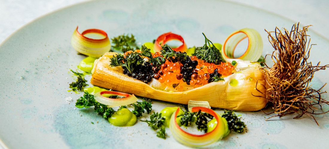 Langtidsstekt purre 160 grader til den er ferdig. Del purren på midten, men behold roten. Fyll med rømme, kaviar og rogn. Anrett med fritert persille, dillmajones og rabarbra.